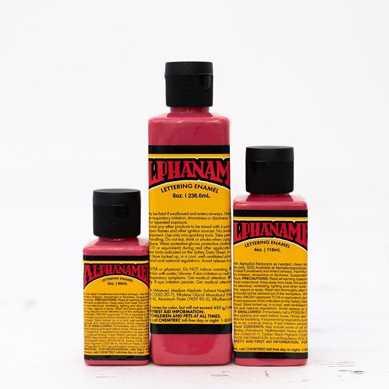 Alphanamel – profesionální emailová barva pro písmomalířství a linkování. Lepší krycí schopnost, hladší tok, vyšší lesk a delší životnost než jiné barvy na trhu. Dodává se s kuličkou uvnitř láhve pro lepší promíchání.