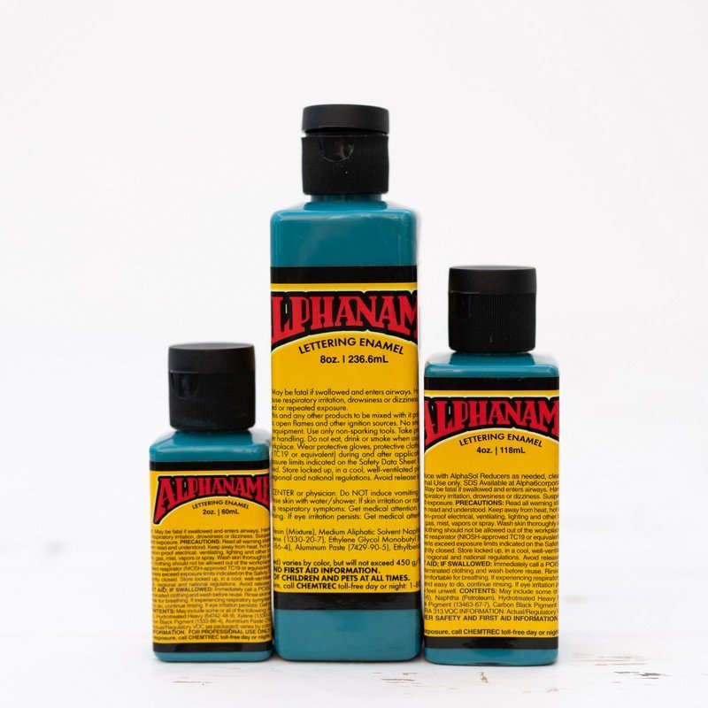 Alphanamel – profesionální emailová barva pro písmomalířství a linkování. Lepší krycí schopnost, hladší tok, vyšší lesk a delší životnost než jiné barvy na trhu. Dodává se s kuličkou uvnitř láhve pro lepší promíchání.