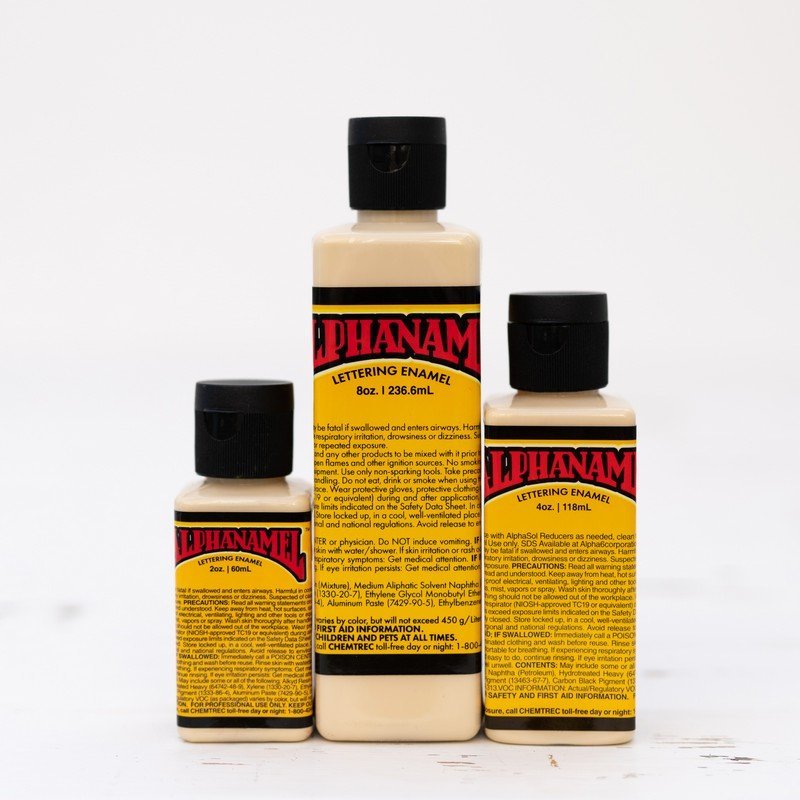 Alphanamel – profesionální emailová barva pro písmomalířství a linkování. Lepší krycí schopnost, hladší tok, vyšší lesk a delší životnost než jiné barvy na trhu. Dodává se s kuličkou uvnitř láhve pro lepší promíchání.