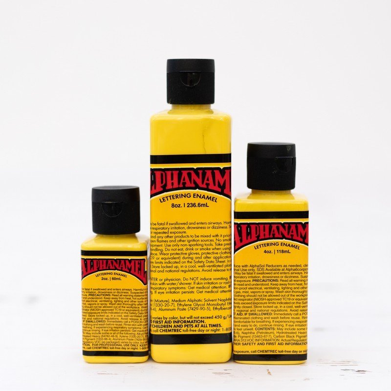 Alphanamel – profesionální emailová barva pro písmomalířství a linkování. Lepší krycí schopnost, hladší tok, vyšší lesk a delší životnost než jiné barvy na trhu. Dodává se s kuličkou uvnitř láhve pro lepší promíchání.