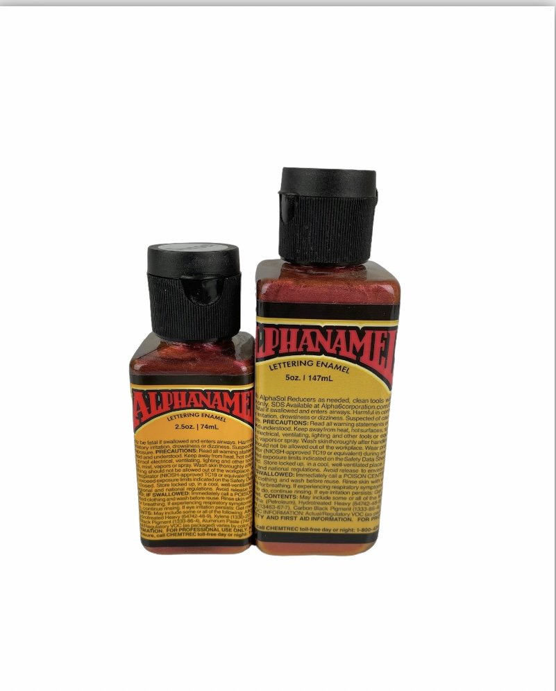 Alphanamel – profesionální emailová barva pro písmomalířství a linkování. Lepší krycí schopnost, hladší tok, vyšší lesk a delší životnost než jiné barvy na trhu. Dodává se s kuličkou uvnitř láhve pro lepší promíchání.