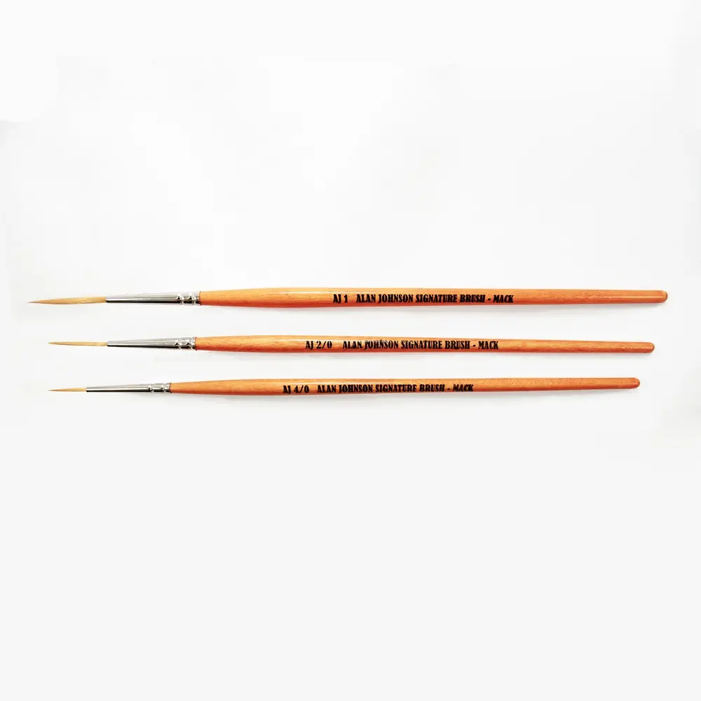 Tento štětec má jasně oranžovou rukojeť, niklovou objímku a tenké zlaté taklonové štětiny. Tento štětec je ideální pro podpisy a práci s detaily. Jedná se o velmi speciální štětec, který veterán Pinstriper Alan Johnson používá k podepisování svých panelů.